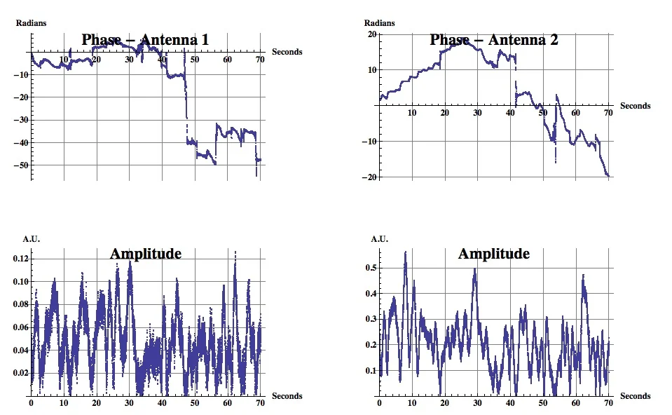 Antenna 1 is the temporary vertical and antenna 2 is the dipole, which had a noticeably better signal; but both signals faded in and out. The phase plots don't look very pretty and that's because I've been using an unsophisticated phase unwrapping algorithm. Each digitized signal is composed of the I and Q components, and the phase angle is the inverse tangent of their ratio. However the inverse tangent is a multi-valued function which repeats every 2 pi, and the computed phase value always lies between -pi and +pi. If we assume that the phase is continuous, we can "unwrap" it when, for example it rises to pi and then immediately thereafter takes on the value of -pi as it wraps around. A general problem is that noise on the signal can make the unwrapping more difficult, particularly when the signal amplitude is very small and the noise contribution is very large. That's cause of the jumps in the phase in the above plots. I really need to write a better phase unwrapping algorithm, but as they say "this problem is a topic of current research" which means there isn't a known "best" algorithm. But I'll put that off to another day and continue the analysis with what I have, concentrating on the amplitude signal.
